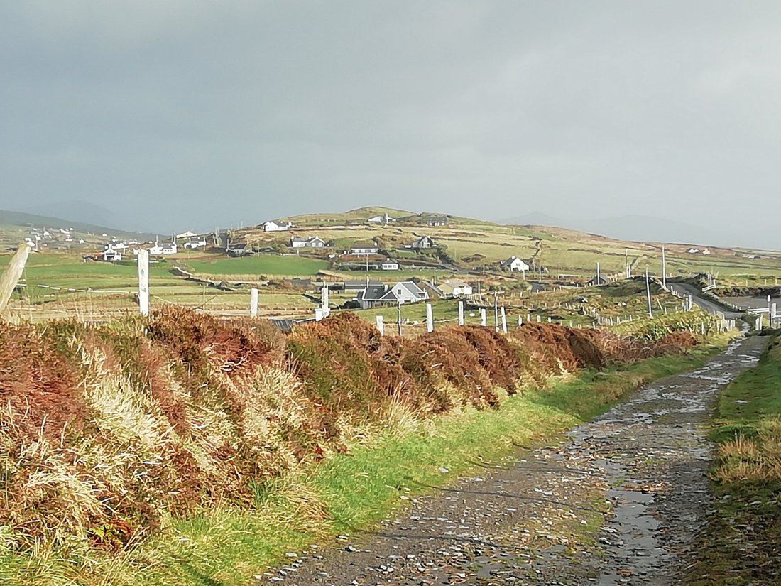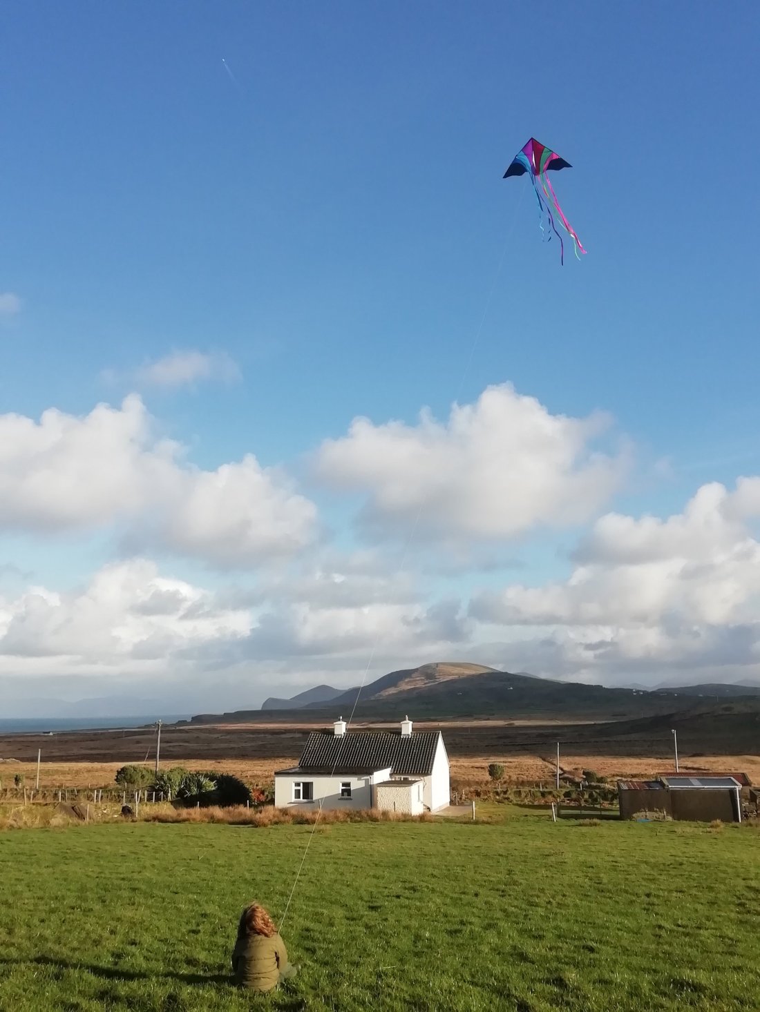 Sometimes I feel like pinching myself to see if it is really me? Yes me who is walking down a long quiet road looking at the ever-changing weather misty rain, fog coming in over the hills or the ever-changing light changing the colours of the scenes before my eyes. As I walk to the house with the wind in my back blowing my hair to soon step into my houses to light an interesting turf fire to add some glow to the end of my day.